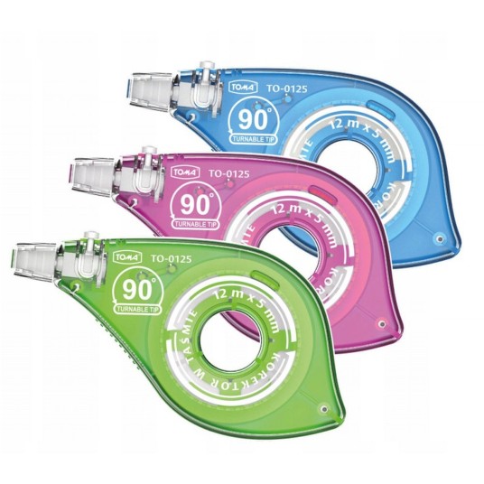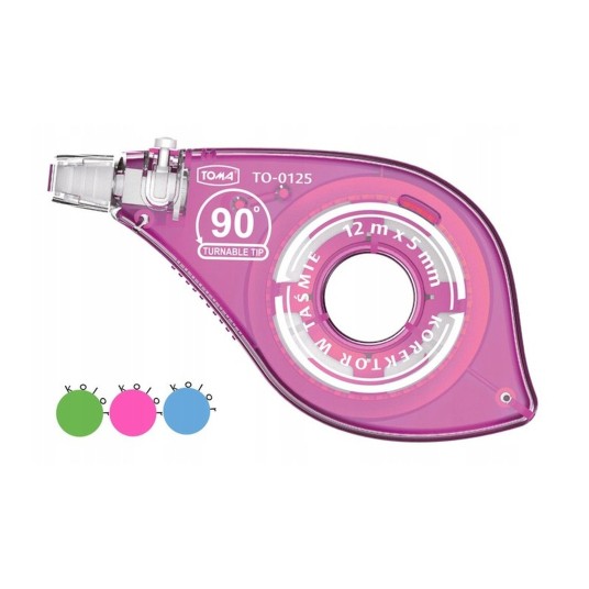 Taśma korekcyjna TOMA Twist to praktyczne narzędzie do szybkiego korygowania tekstu na papierze bez użycia płynów. Szerokość taśmy wynosi 5 mm, a długość 12 m, co pozwala na wielokrotne jej użycie. Obrotowa końcówka ułatwia aplikację taśmy pod różnym kątem, co zwiększa precyzję poprawek.