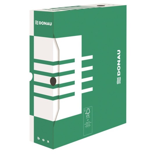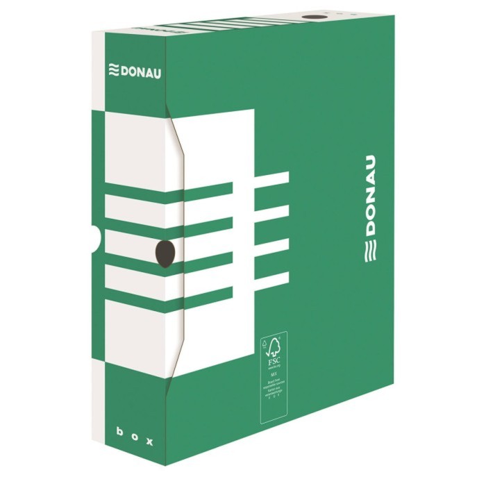 Pudło archiwizacyjne DONAU o szerokości 80 mm wykonane jest z trwałej, trójwarstwowej tektury falistej, która chroni dokumenty przed uszkodzeniami, wilgocią i kurzem. Bezkwasowy odczyn (>7,5 pH) sprawia, że nadaje się do bezpiecznej, długoterminowej archiwizacji. Konstrukcja obejmuje pięć otworów ułatwiających przenoszenie oraz pięć ścian opisowych wspierających organizację zawartości. Specjalny design pozwala ustawiać pudło na krótszym lub dłuższym boku. Mieści jeden segregator lub jego zawartość. Produkt posiada certyfikat FSC.