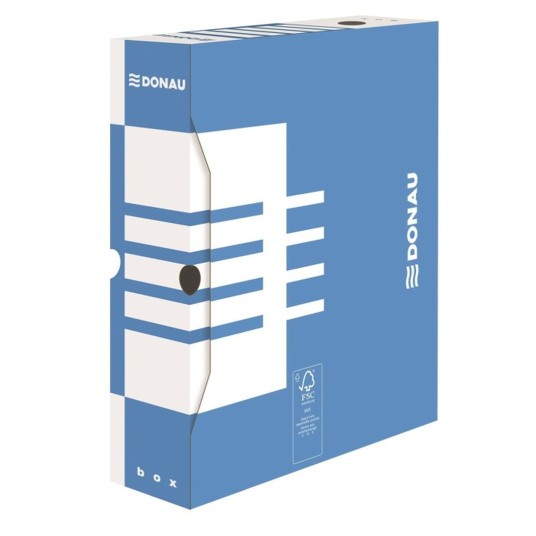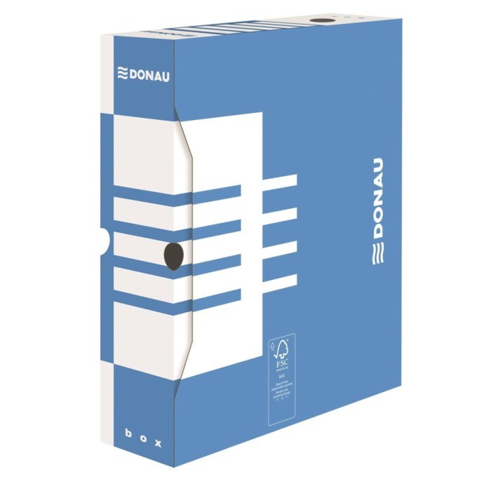 Pudło archiwizacyjne DONAU o szerokości 80 mm wykonane z trójwarstwowej tektury falistej skutecznie chroni dokumenty przed uszkodzeniami, kurzem i wilgocią. Bezkwasowy odczyn (>7,5 pH) czyni je odpowiednim do długotrwałej archiwizacji. Konstrukcja z pięcioma otworami ułatwia przenoszenie i zdejmowanie z półek, a pięć ścian opisowych pozwala na wygodne oznaczenie zawartości. Specjalny design umożliwia ustawienie pudła zarówno na krótszym, jak i dłuższym boku. Mieści jeden segregator lub jego zawartość. Produkt posiada certyfikat FSC.