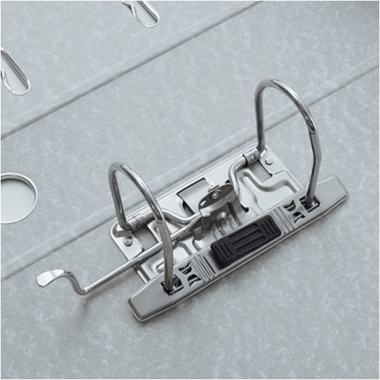 otwory blokujące przednią okładkę, otwór na palec na grzbiecie i metalowe okucia na dolnych krawędziach ułatwiają użytkowanie i bezpieczne przechowywanie dokumentów