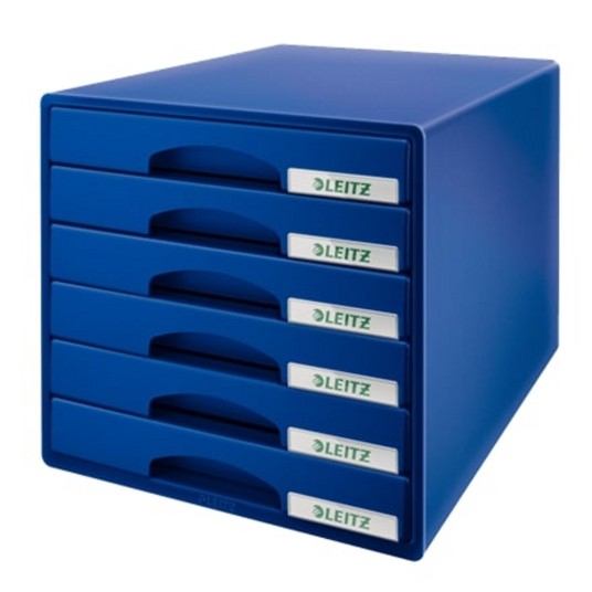 Pojemnik na dokumenty LEITZ PLUS z sześcioma szufladami, wykonany z trwałego tworzywa, w kolorze niebieskim. Idealny do organizacji dokumentów w biurze, oferuje łatwy dostęp i przejrzystość dzięki różnej wysokości szuflad. Solidna konstrukcja zapewnia długotrwałe użytkowanie.