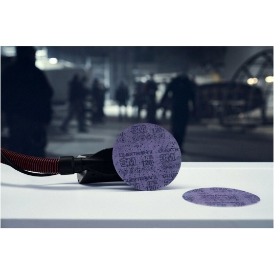 Dysk ścierny 3M™ Cubitron™ II 775L Hookit™ z wieloma otworami zapewnia optymalne odprowadzanie pyłu, co zwiększa produktywność i żywotność narzędzia. Wykorzystuje technologię precyzyjnie kształtowanego ziarna ceramicznego, która pozwala na szybkie i efektywne cięcie, zapewniając jednolite wykończenie. Nośnik z folii zwiększa odporność na rozdarcia i elastyczność.