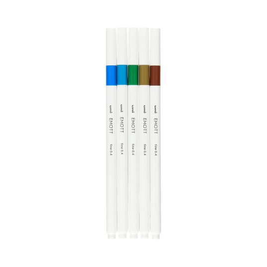 zestaw zawiera 5 cienkopisów: pastelowy niebieski, turkusowy, zielony sosnowy, ciemnożółty, brązowy