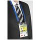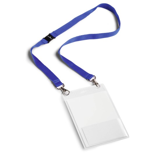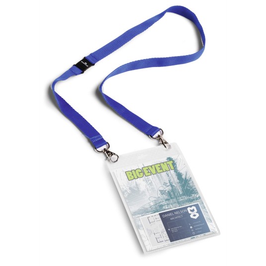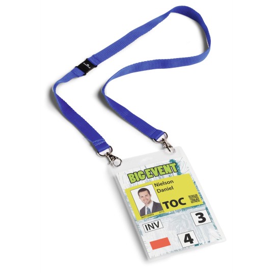 Pionowy identyfikator DURABLE w formacie A6 z przezroczystą kieszonką na dokumenty oraz slotem na wizytówkę. Wyposażony w mocną tekstylną taśmę w kolorze granatowym i karabińczyk, który umożliwia łatwe przypięcie do ubrania lub smyczy.