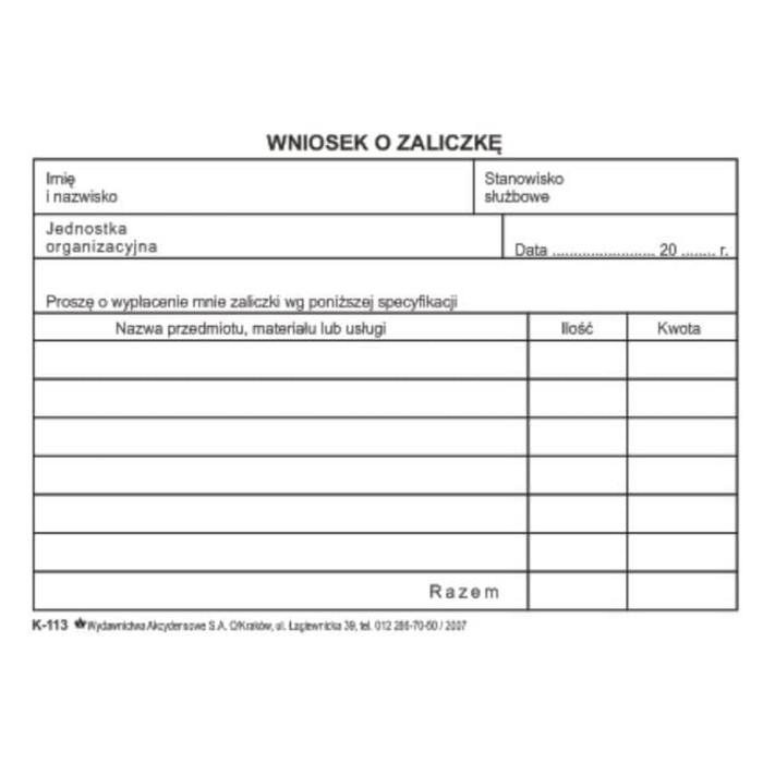 Druk - Wniosek o zaliczkę offset A6 WYDAWNICTWA AKCYDENSOWE poziomy dwustronna [K-113]