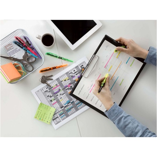 Zakreślacz to narzędzie z precyzyjną, skośną końcówką umożliwiającą podkreślanie tekstu różnej grubości linii. Fluorescencyjny tusz na bazie wody schnie błyskawicznie, nie rozmazuje się i nie przebija na drugą stronę kartki. Smukły, ergonomiczny korpus z antypoślizgowym uchwytem zapewnia wygodę pracy, a skuwka z klipsem pozwala na szybkie przypięcie przyrządu do notatnika czy kieszeni. Dzięki specjalnej formule tusz pozostaje żywy nawet po dłuższym czasie niesięgania po marker.