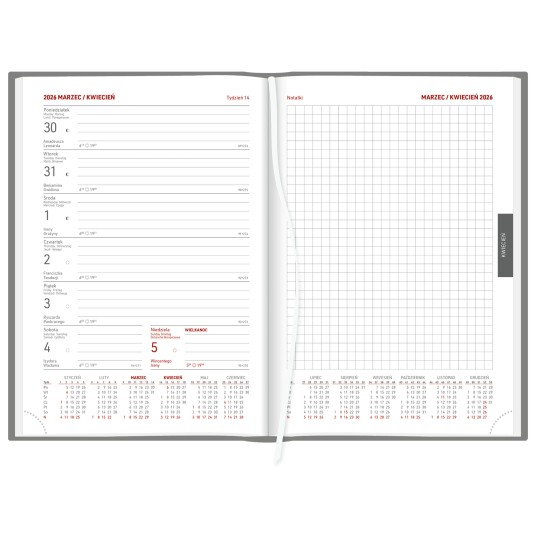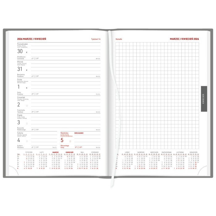 Kalendarz książkowy A5 z układem tygodniowym i wbudowanym notesem, idealny do planowania zadań i zapisków. Oprawa Aluminium w kolorze srebrnym nadaje nowoczesny wygląd oraz zwiększa trwałość okładki. Papier biały o gramaturze 70 g/m² zapewnia komfort pisania, a liczne dodatki ułatwiają organizację roku 2026.