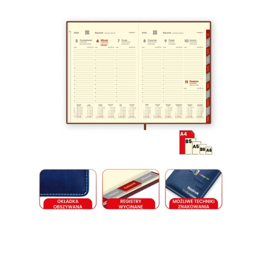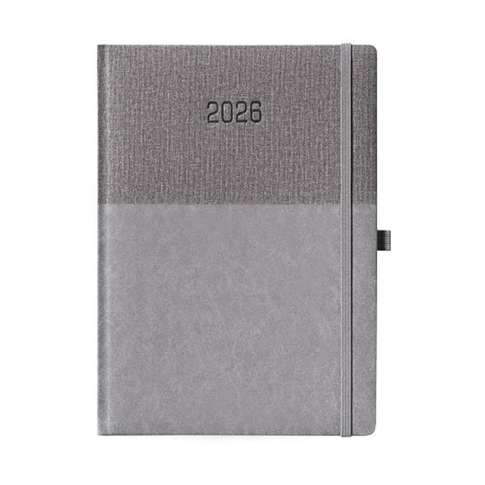 Elegancki kalendarz książkowy w formacie A4 z tygodniowym układem i gumką spinającą, zaprojektowany do efektywnego planowania w biurze lub domu. Każda rozkładówka przedstawia pełen tydzień, a wycinane registry umożliwiają szybkie przechodzenie między miesiącami. Papier chamois wysokiej jakości zapewnia komfort pisania, a mnóstwo dodatków (plan roczny, mapa, teleadresownik) zwiększa funkcjonalność. Szara oprawa o profesjonalnym wyglądzie z zaokrąglonymi rogami i elastyczną gumką spinającą chroni notes i pozwala na wygodę w użytkowaniu.