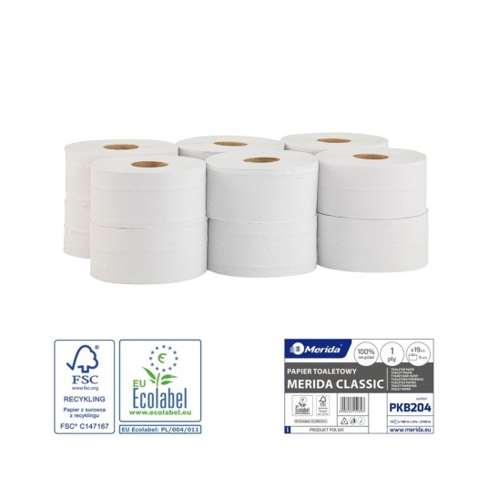 Papier toaletowy makulaturowy 1 warstwa kol. biały MERIDA Economy Ø190 mm szer. 90 mm dł. 180 m | 12 rolek PBK204