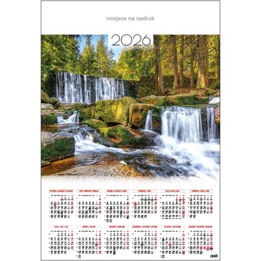Kalendarz ścienny w formacie B1 z grafiką „Wodospad w Karpaczu”, z tygodniowym układem i trzójęzycznym kalendarium. Metalowe listwy z otworem ułatwiają zawieszenie. Papier kredowy 170 g/m² zapewnia wysoką jakość druku.