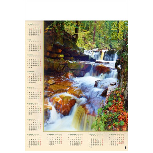 Kalendarz ścienny w formacie B1 z motywem „Leśny Potok”, wyposażony w miesięczne kalendarium i miejsce na notatki. Dzięki artystycznej ilustracji i dużemu formatowi świetnie sprawdzi się jako dekoracja oraz praktyczny planer w przestrzeniach domowych i biurowych.