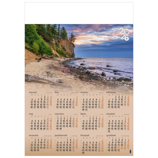 Kalendarz planszowy formatu A1 z grafiką „Bałtycki Klif”, przeznaczony do powieszenia na ścianie w dużych pomieszczeniach. Miesięczne kalendarium zawiera miejsce na notatki i ważne daty, a estetyczny motyw krajobrazowy stanowi ozdobę wnętrza.