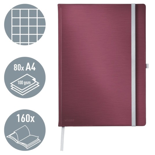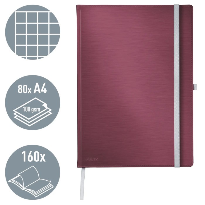 Notatnik Leitz Style w formacie A4 z wkładem w kratkę, o klasycznym i eleganckim wyglądzie. Twarda okładka w kolorze rubinowej czerwieni oraz funkcjonalne dodatki sprawiają, że świetnie sprawdzi się w pracy, szkole i codziennym użytkowaniu.