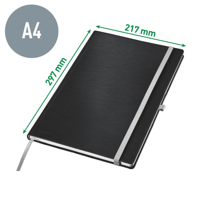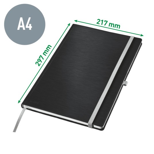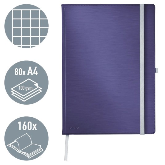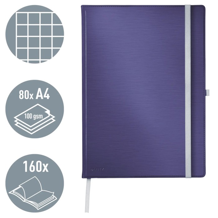 Twardy notatnik Leitz Style w formacie A4 z kratkowanym wkładem, wyposażony w praktyczne dodatki jak gumka do zamykania, kieszonka wewnętrzna i uchwyt na długopis. Idealny do notatek, analiz i pracy biurowej.