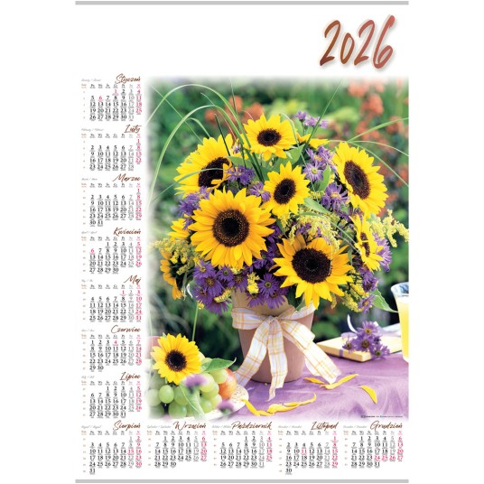 Kalendarz ścienny w formacie A1 z motywem „Słoneczniki”. Elegancka plansza z barwną grafiką i przejrzystym kalendarium na cały rok 2026, idealna do dekoracji biura lub domu.