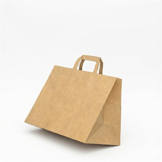 Papierowa torba z płaskim uchwytem przeznaczona do pakowania prezentów, materiałów promocyjnych lub lekkich przedmiotów. Prosta i praktyczna, odpowiednia do użytku sprzedażowego lub domowego.