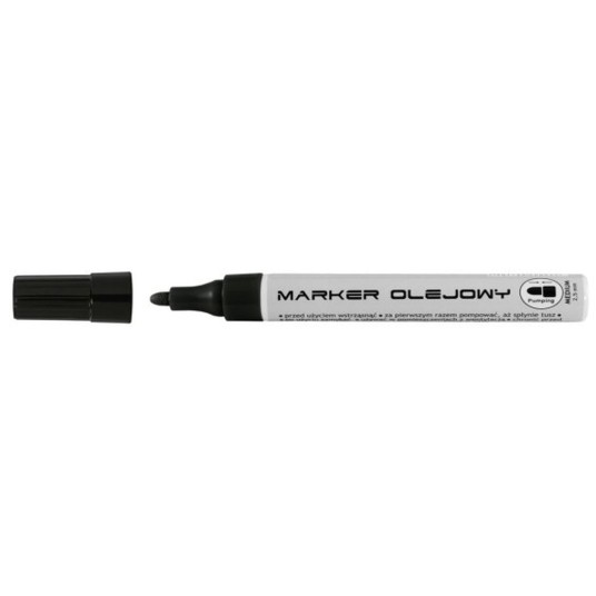 marker olejowy w kolorze czarnym jest wyposażony w aluminiową obudowę i akrylową końcówkę o grubości 2,5 mm